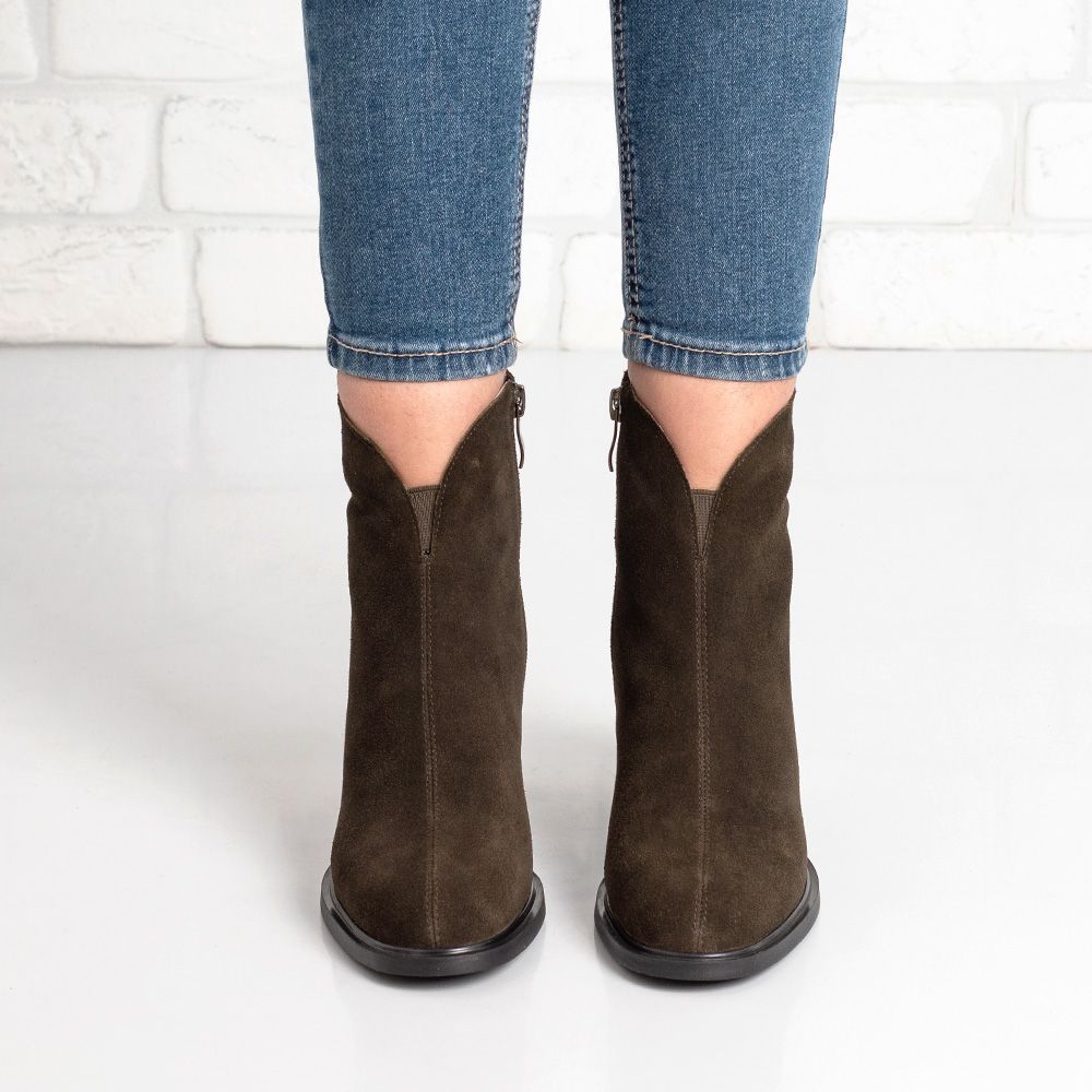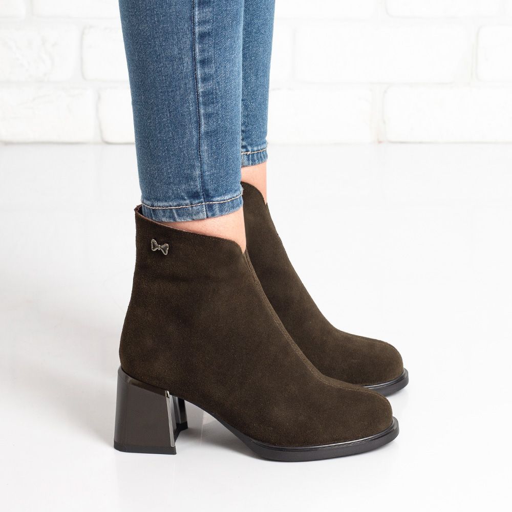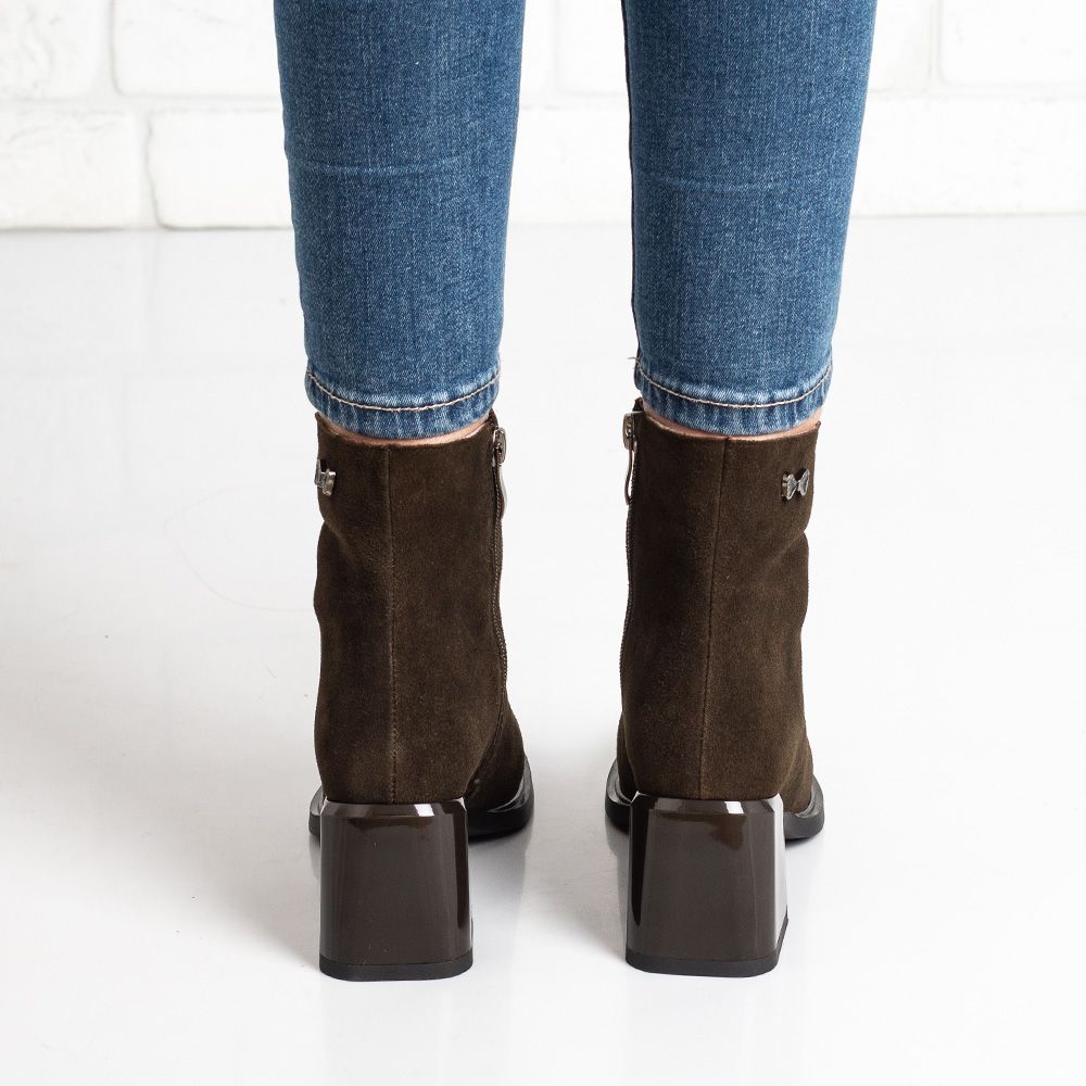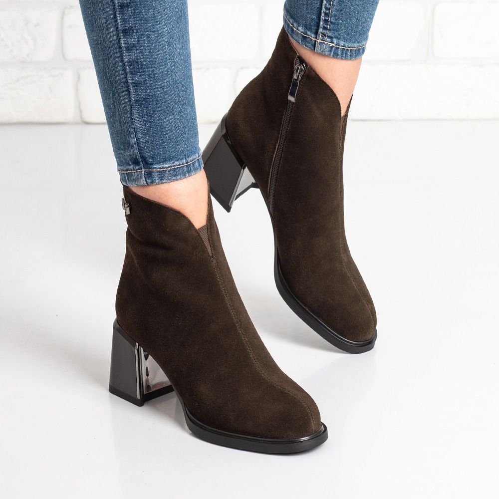 Стилни и комфортни дамски боти на ток в кафяво, изработени от естествен велур.