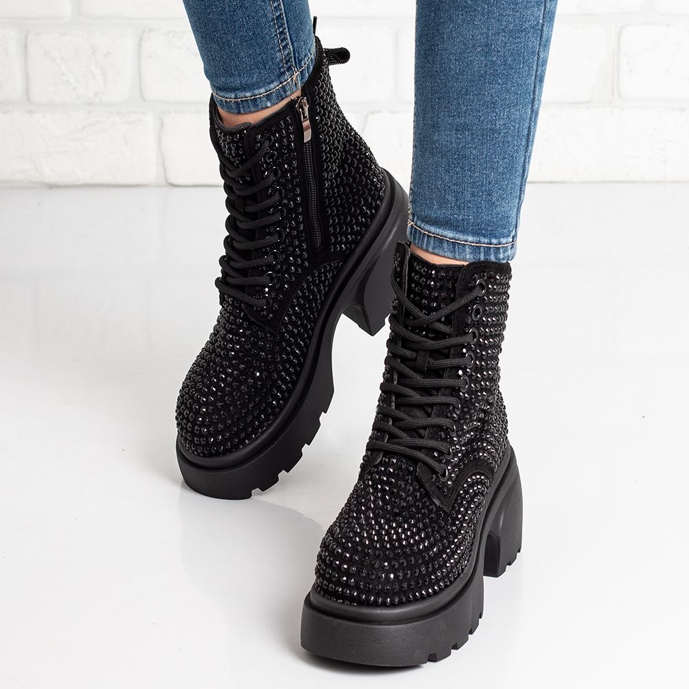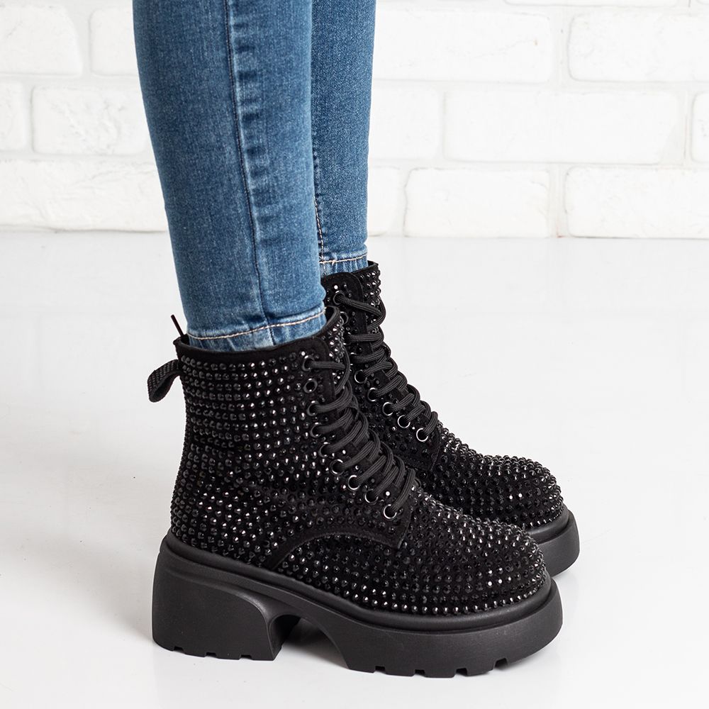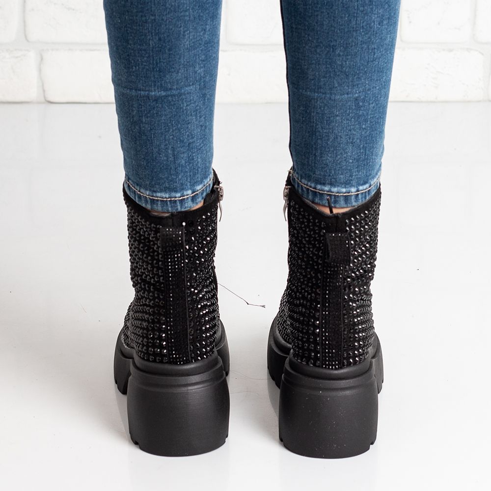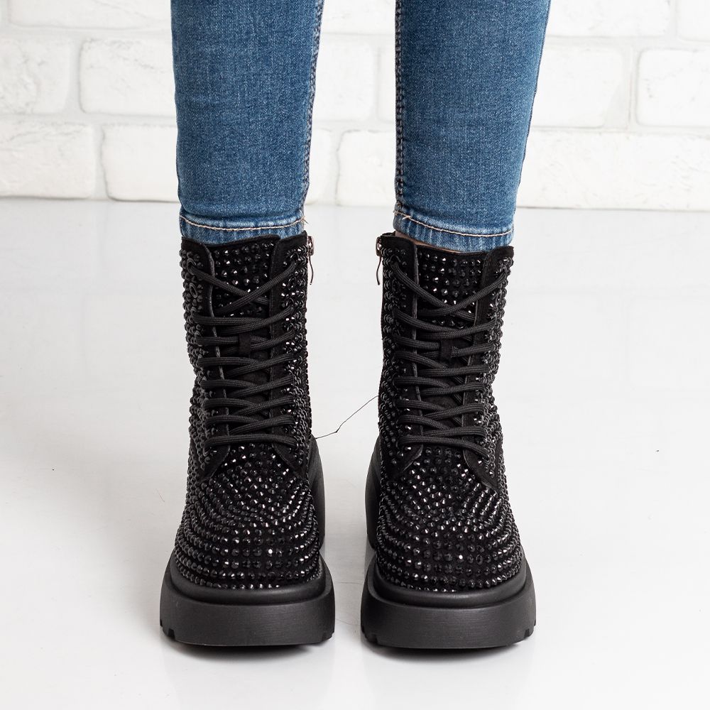 Уникални и ефектни дамски боти в черно с черни камъчета!