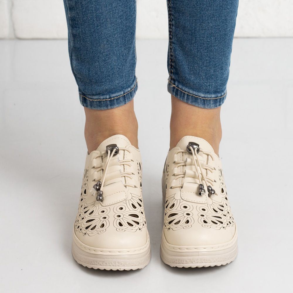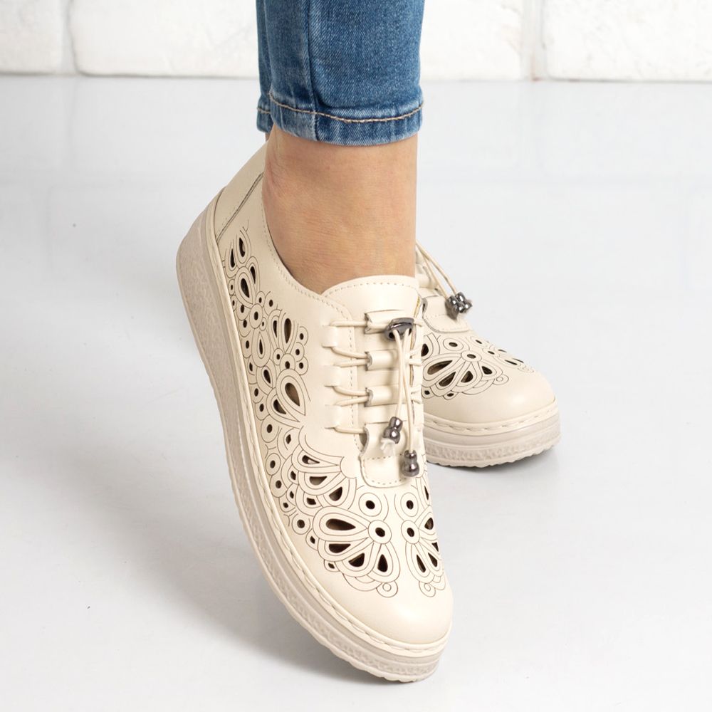 Ниски обувки в бежово перфорирана еко кожа. Леката и дишаща структура осигурява максимален комфорт и свежест през целия ден, което ги прави идеален избор за топлите сезони.