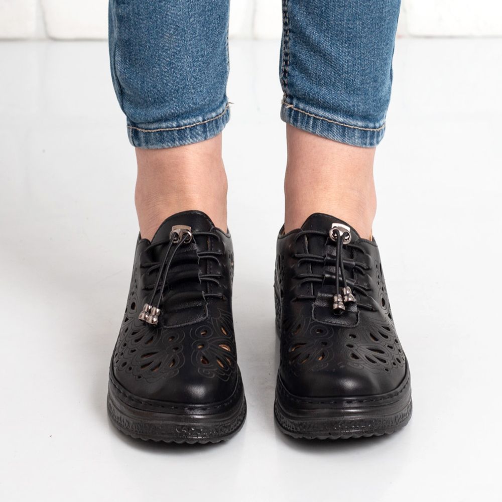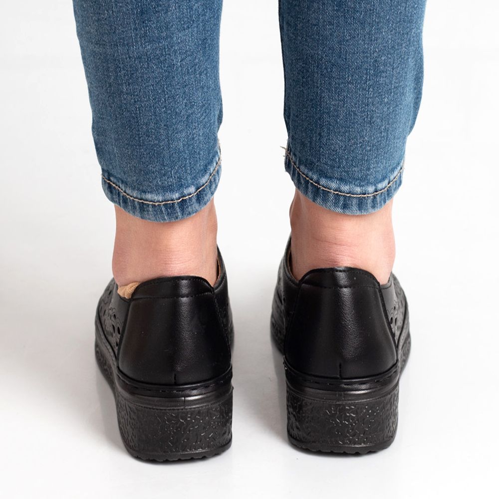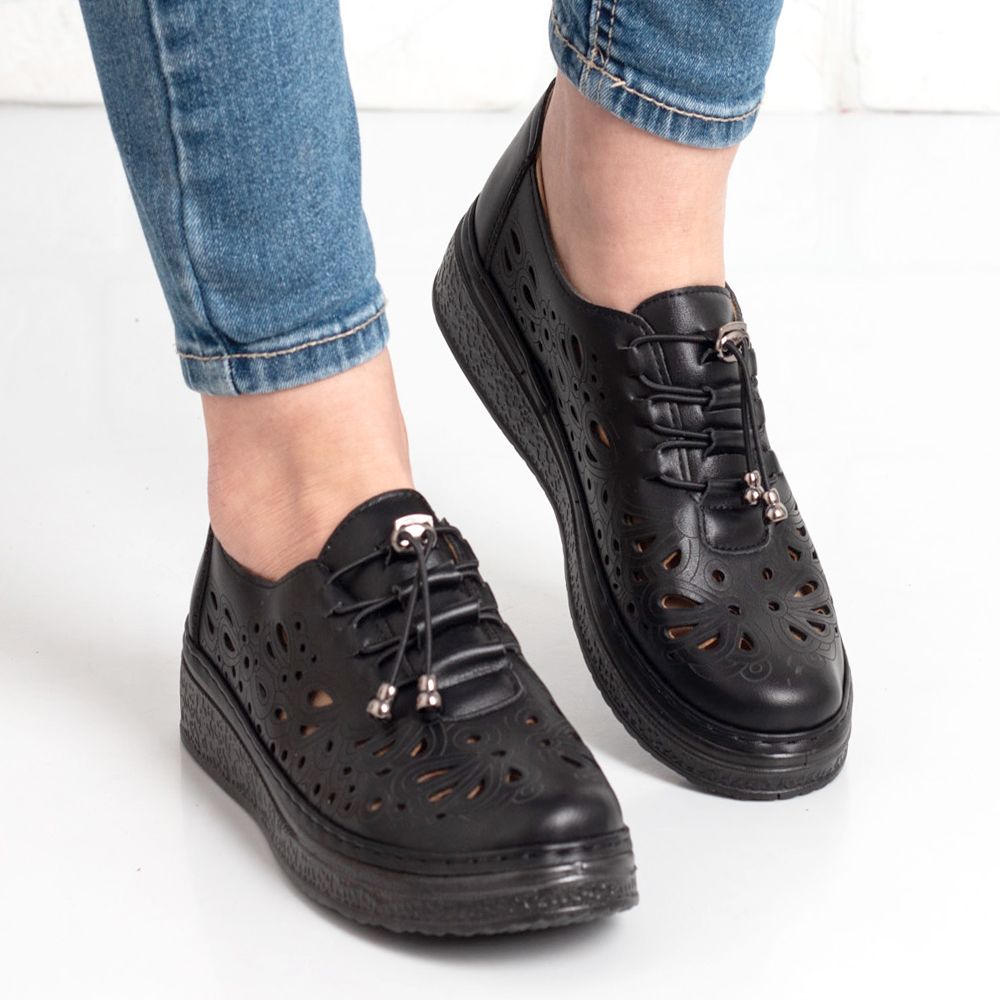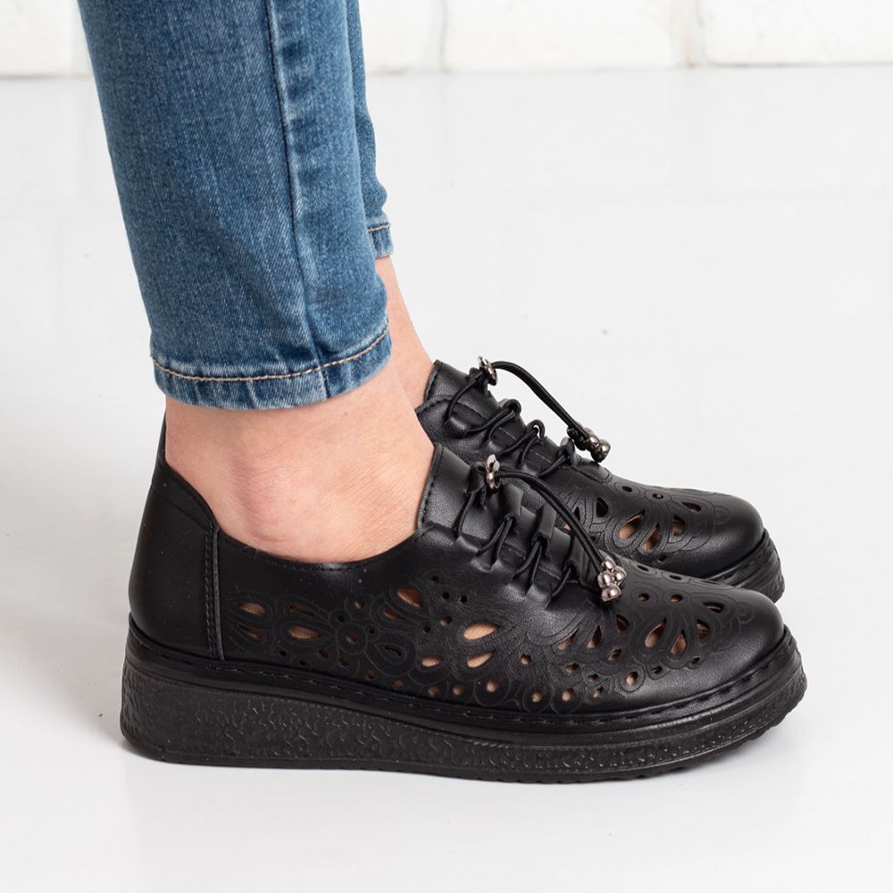 Ниски обувки в черно перфорирана еко кожа. Леката и дишаща структура осигурява максимален комфорт и свежест през целия ден, което ги прави идеален избор за топлите сезони.